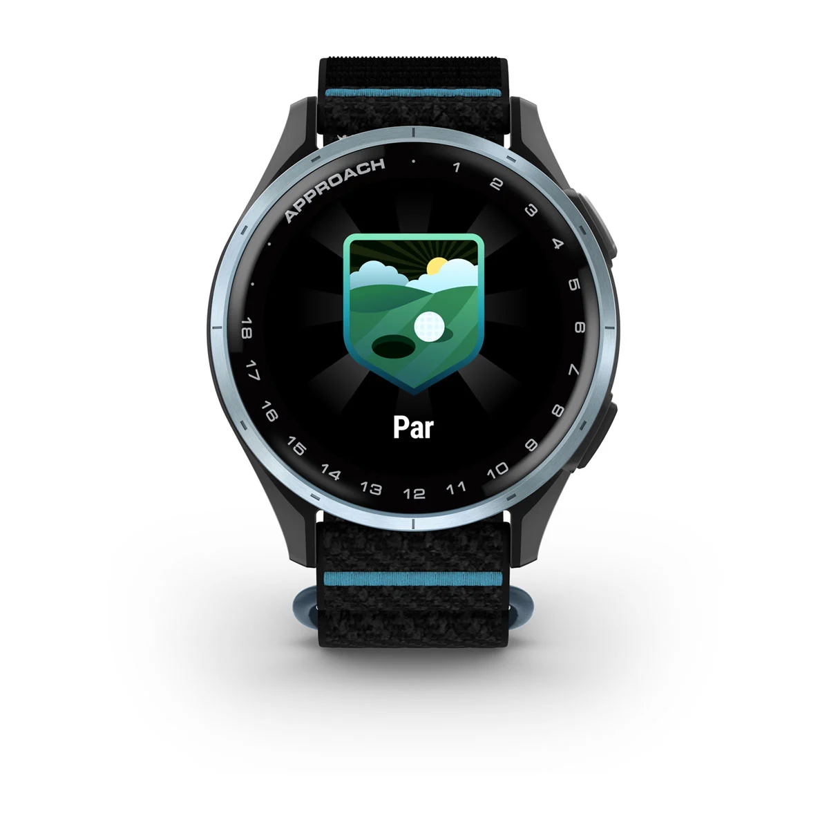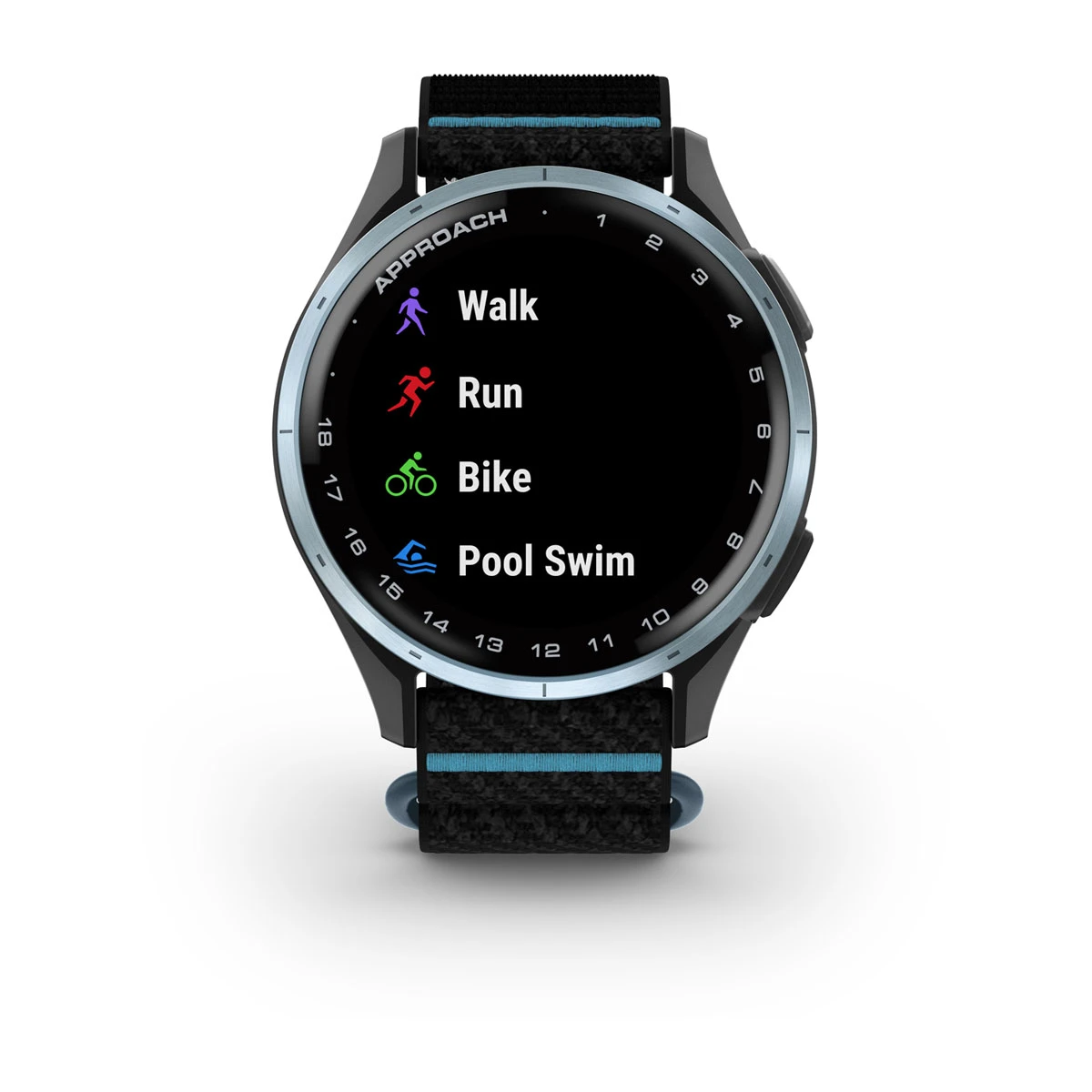 Approach® J1 – Cloud blue aluminium bezel with black/azure ComfortFit fabric band